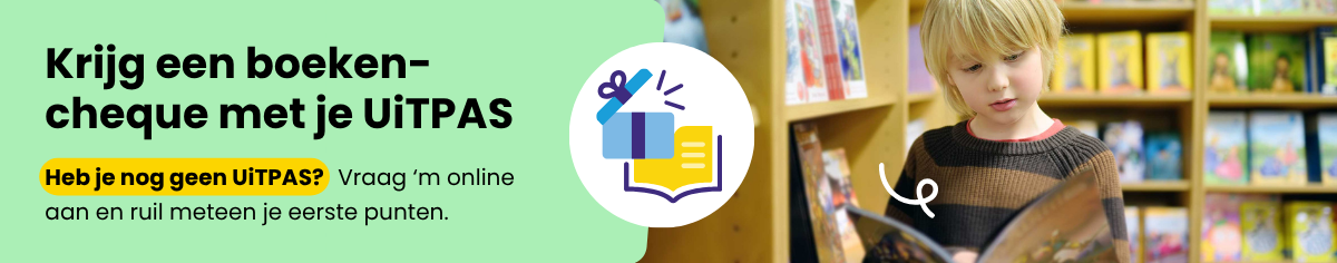 Heb je nog geen UiTPAS? Vraag er online eentje aan. Je krijgt meteen 3 UiTPAS-punten cadeau, precies genoeg voor je boekencheque.